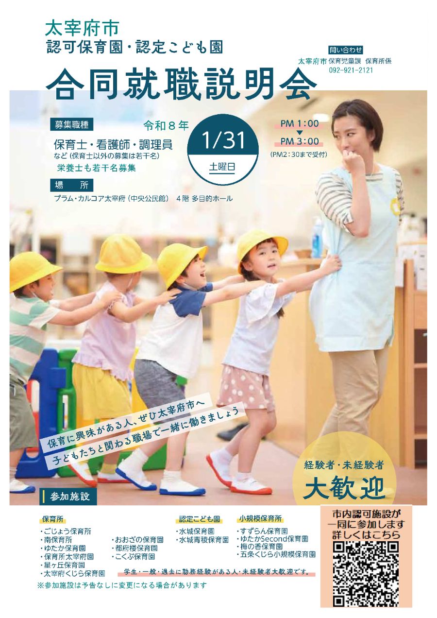 保育士資格、看護師資格、栄養士資格を持っている人、取得見込みの人で、太宰府市内の認可保育施設で働いていただける人を対象に、太宰府市内認可保育園・認定こども園合同の就職説明会が開催されます。