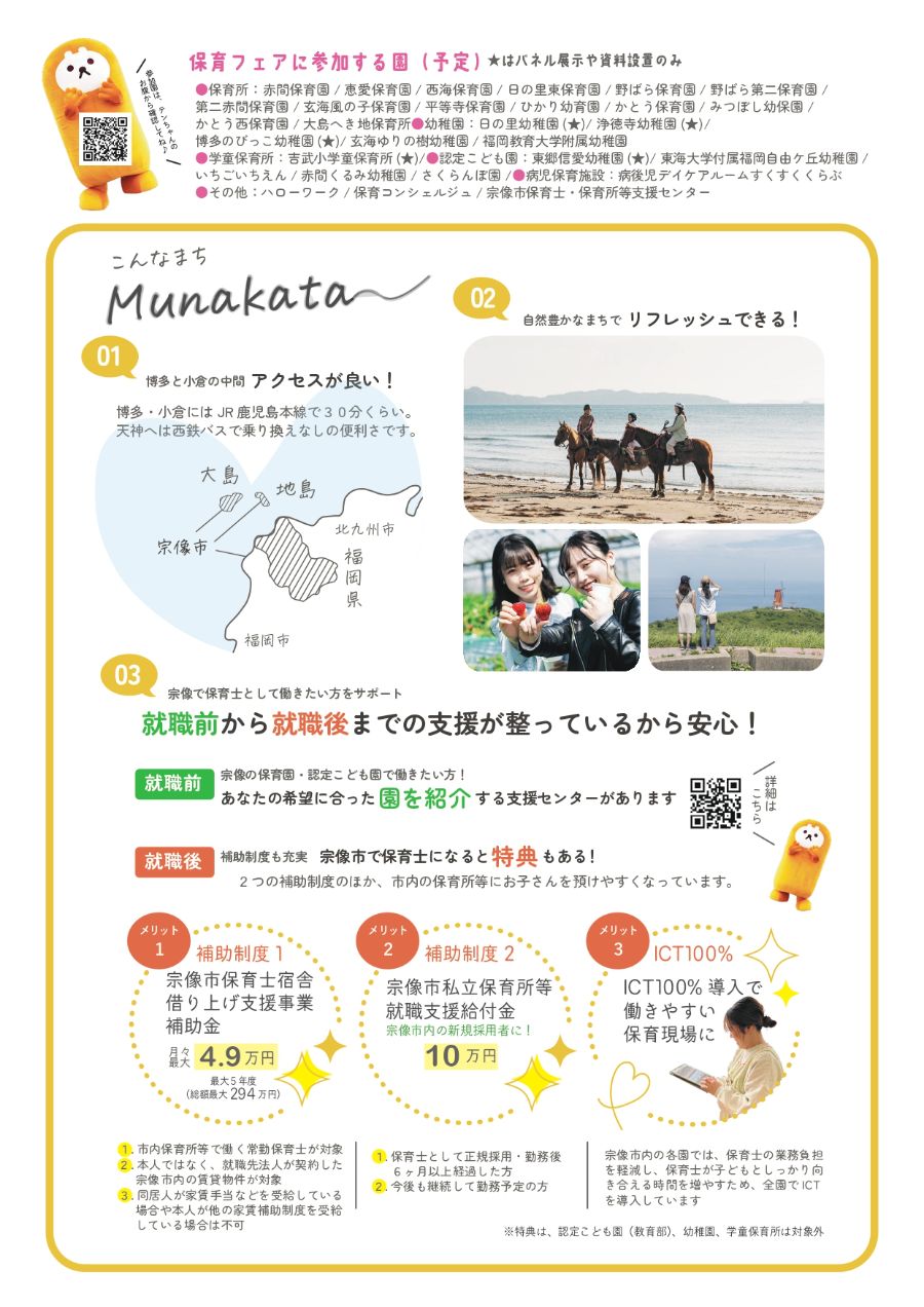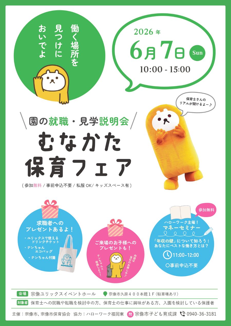 この度宗像市では宗像市保育協会と共同して、市内の保育所等で働きたい保育士さんや保護者の方を対象に「第4回むなかた保育フェア」を実施します。